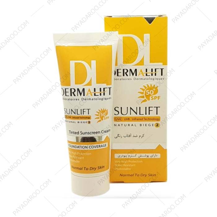 کرم ضد آفتاب SPF50 پوست خشک و معمولی بژ طبیعی درمالیفت هم یک ضد آفتاب قوی و هم یک کرم پودر است. این کرم نه تنها از پوست در برابر اشعه‌ های مضر خورشید محافظت می‌ کند بلکه یک پوشش کرم‌ پودری نیز روی پوست صورت ایجاد می‌ کند. این کرم در برابر تعریق و شستشو مقاوم است و به راحتی و بدون مواد شوینده از روی صورت پاک نمی‌ شود. افرادی که پوست خشک و معمولی دارند می‌ توانند از این کرم ضد آفتاب استفاده نمایند. کرم ضد آفتاب سانلیفت درمالیفت چربی‌ های طبیعی روی پوست را افزایش می‌ دهد اما از بروز جوش و آکنه جلوگیری می‌ نماید. استفاده از این محصول سبب جلوگیری از پیری زودرس و همچنین افزایش طراوت و شادابی پوست می‌ شود. با مصرف این کرم دیگر نیازی به استفاده از کرم پودر ندارید. این کرم ضدآفتاب در مدل های بی رنگ، بژ روشن و بژ طبیعی تولید و عرضه شده است.